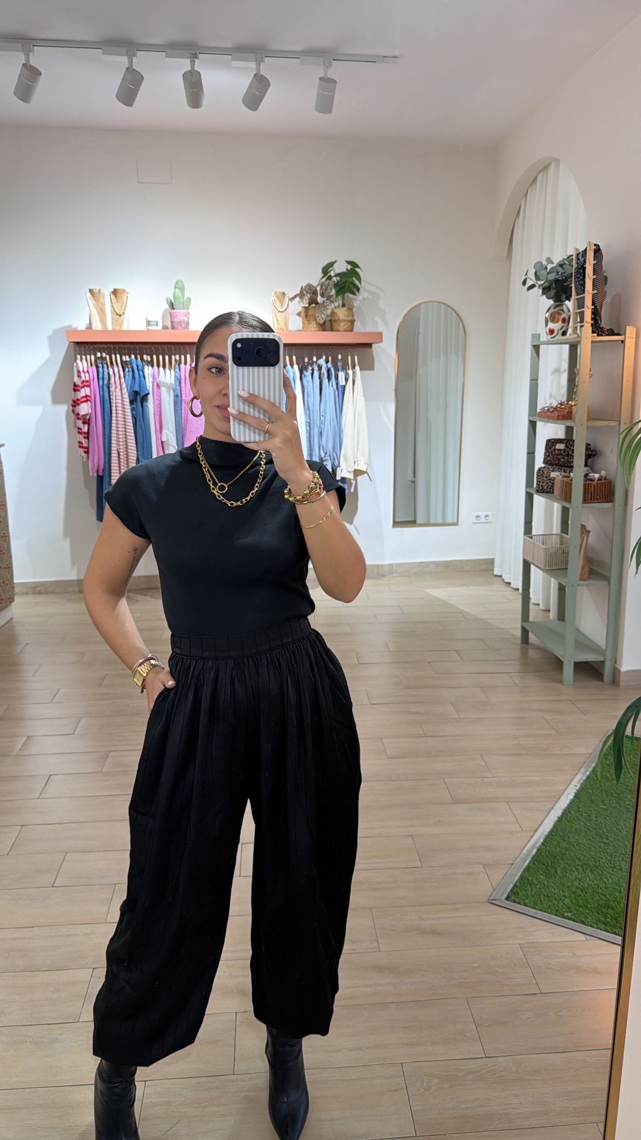 Pantalon satinado bombacho con detalles horizontales, elastico en la parte de atrás y cremallera invisible en la parte derecha. Tiene bolsillos. En la foto tiene puesto talla S